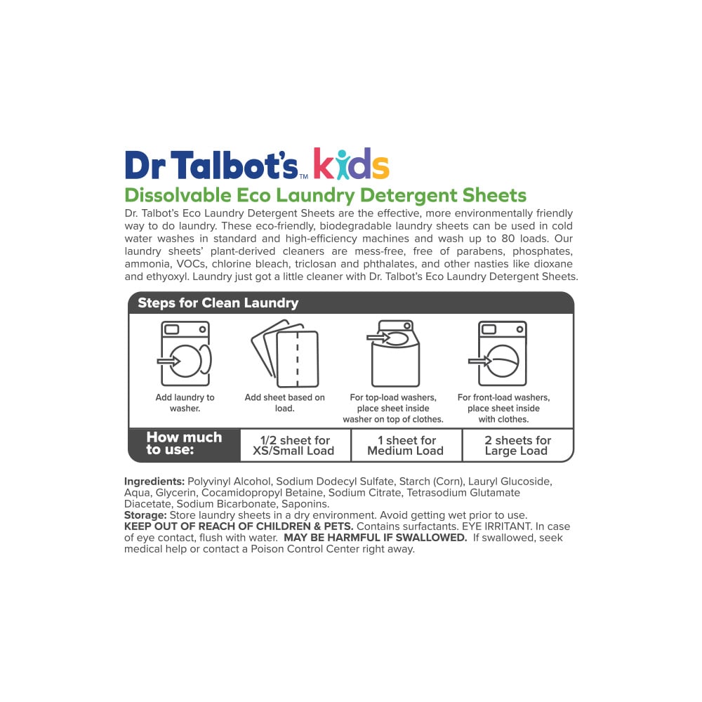 - EFFECTIVE CLEANING: Dr. Talbot's Eco Laundry Detergent Sheets effectively clean heavily soiled items and meet your everyday laundry needs.