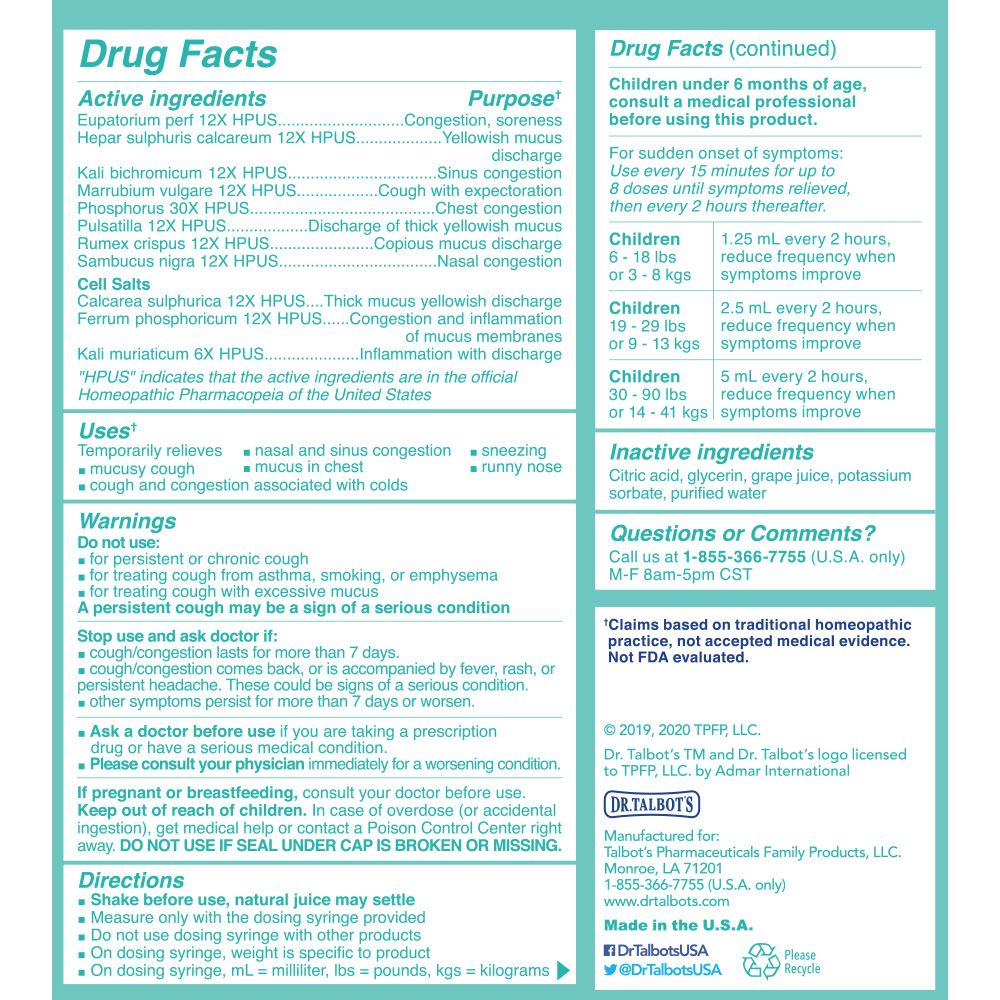 Dr. Talbot’s Mucus + Cold Relief temporarily relieves symptoms of thick mucus, runny nose & cough, nasal & chest congestion, and sinus inflammation. Our safe choice medicine uses a combination of homeopathic ingredients and cell salts to provide relief to your child. Using real fruit juice to provide a great flavor to our medicines, you can be assured your child will not put up a fuss when medicine must be given. Created without unnecessary or harmful fillers, Dr. Talbot's mucus + cold Relief does not contain alcohol, dyes or parabens. Rest easy knowing that our products use only the best that Mother Nature has to offer.