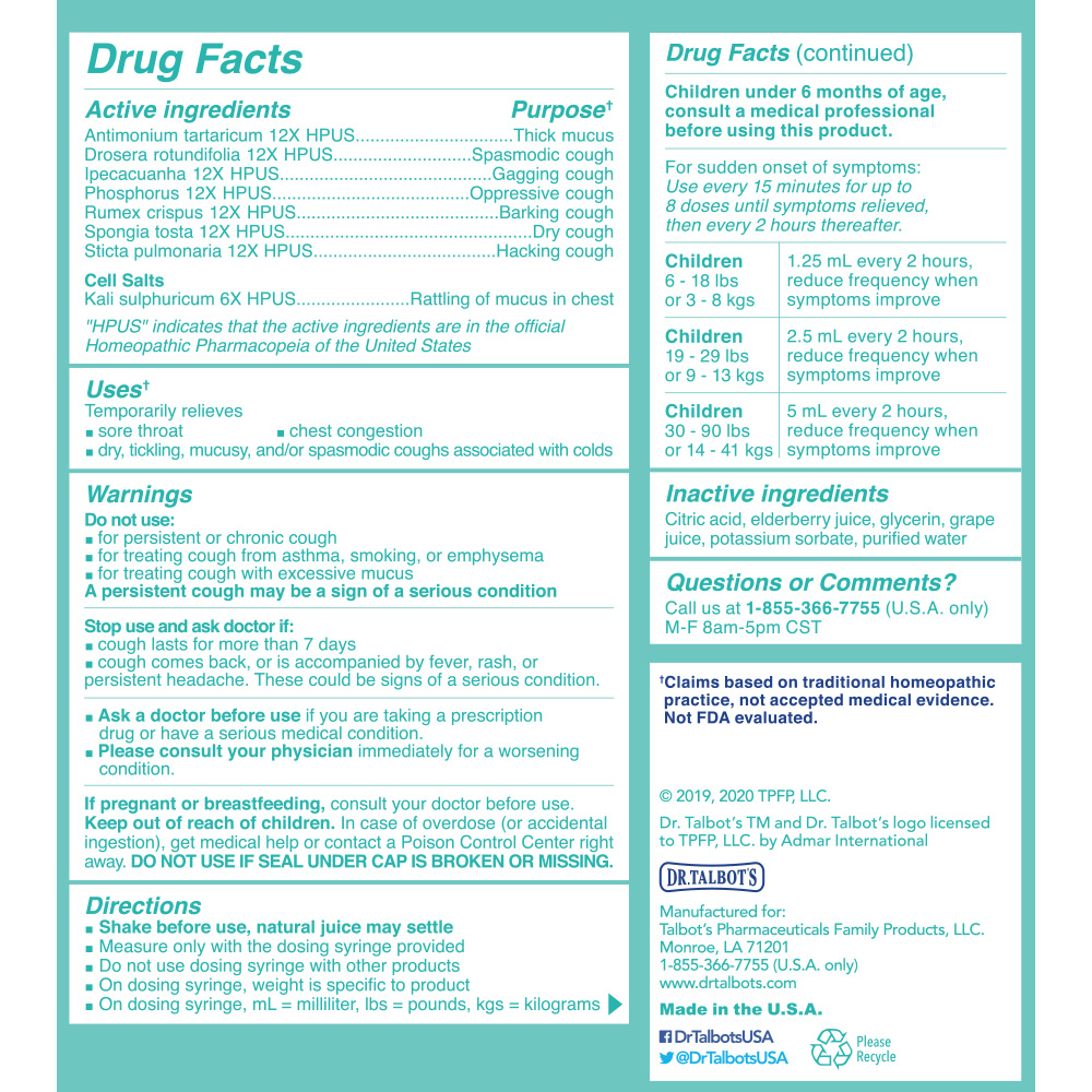 Dr. Talbot's Cough Relief temporarily relieves sore throat, chest congestion, and those annoying dry or itchy coughs.* Check our guidelines for different age groups to ensure you're giving your child the right dose for their age.